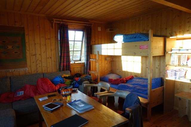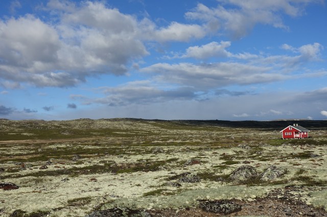 Am Montag ging es für uns bis nach Kalhovd, einer Touristenhütte, die im Sommer bewirtschaftet ist. Da aber hier noch nicht wirklich Sommer ist und die Hütte erst Ende des Monats öffnet, kamen wir in der angeschlossenen Selbstbedienungshütte unter. Anders als die meisten DNT Hütten, versprüht Kalhovd wirklich nicht allzu großen Charme. Dennoch, bei Wind und Regen und 8 Grad Außentemperatur ist jede Hütte auf ihre Art gemütlich. In Regen und Wind ging es auch am Dienstagmorgen weiter, allerdings nicht lange, dann riss der Himmel auf und wir konnten den Rest des Tages die nahe und ferne Bergwelt bestaunen. Immer wieder gingen um uns herum kurze Schauer nieder, wir selbst blieben aber meist verschont. Gegen Abend kam die Mårbu Hütte in Sicht, ebenfalls eine im Sommer bewirtschaftete Hütte. Schon aus der Ferne konnte wir sehen, dass zahlreiche Menschen wie Ameisen um die Hütte wuselten. Nachdem wir den ganzen Tag keine weiteren Wanderer gesehen hatten, irritierte uns der Anblick für einen kurzen Moment, klärte sich aber auf, als wir nach einer Stunde die Hütte erreichten (ja, man kann die Hütten lange sehen, bevor man dort ist….). Es handelte sich um 14 Frauen und Männer, die sich hier zum alljährlichen Dugnad getroffen hatten, dem ehrenamtlichen Instandsetzen und Vorbereiten der Hütten für die Saison. Über mehrere Tage wird emsig renoviert, repariert und geputzt. Da die Haupthütte gerade einen neuen Innenanstrich bekommen hatte, waren alle in der angeschlossenen kleinen Selbstversorgerhütte untergebracht. Und nun kamen auch noch wir hinzu. Aber es wurde einfach ein wenig zusammengerückt und dann passte das schon. Es war ausgesprochen spannend und nett sich mit den fast ausschließlich ältere Männern und Frauen auszutauschen und ich bin am nächsten Morgen mit zahlreichen guten Wünschen für meine weitere Reise zum Nordkapp aufgebrochen.