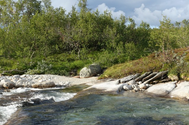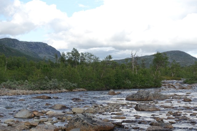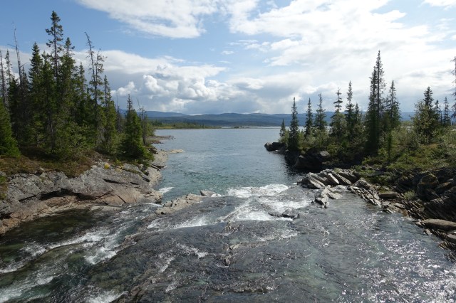 Ein kleines Highlight war eine Flußüberquerung kurz hinter dem nördlichen Ende des Børgefjells, am Daningen See. Kurz stockte mir der Atem, als ich mich der vermeintlichen Brücke näherte. Denn zu sehen waren aus der Ferne lediglich zwei parallele Seile. Etwa so sehen unmontierte Sommerbrücken aus der Ferne oft aus. War die Brücke etwa abgebaut? Aber nein, weit gefehlt. Am Ufer lag ein kleines rotes Boot und die Seile waren Teil eines Seilzuges mit Hilfe dessen man sich im Boot sitzend (oder stehend für die Wagemutigen) ans anderen Ufer ziehen konnte. So ganz einwandfrei lief das Ganze nicht, aber dennoch, es war ein Heidenspaß. Ob Stefan das allerdings auch noch so sah, als er endlich drüben ankam und dann feststellen musste, dass er seine Stöcke auf der anderen Seite vergessen hatte, weiß ich allerdings nicht. Ich bin dann einfach schon mal weitergelaufen.