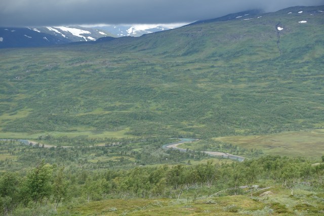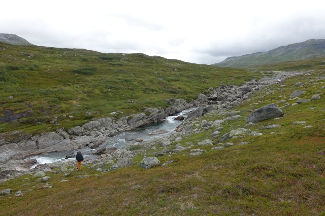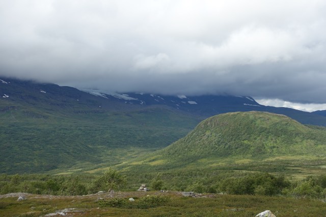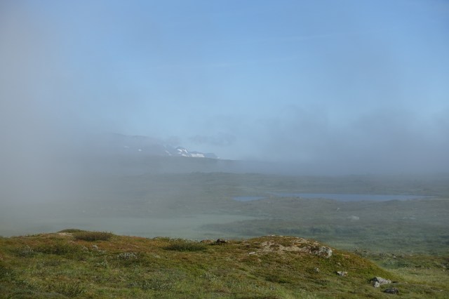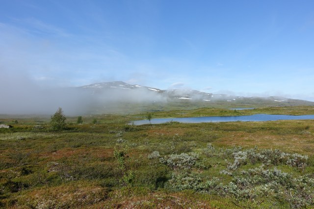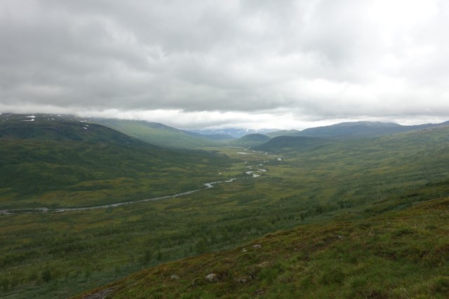 Nach dem Børgefjell folgte der Einstieg in die Nordlandruta, eine relativ unbekannte und wilde Wanderoute entlang der schwedisch – norwegischen Grenze. Auch wenn in den kommenden Tagen ein Schauer den nächsten jagte, war ich von Beginn an völlig Feuer und Flamme für diesen Weg. Wobei ‚Weg‘ ein wenig zu hoch gegriffen ist. Es ist eher eine markierte Route, einen Weg sucht man meist vergebens. Vielleicht war es ein Stück weit auch genau diese ganz bestimmte Wetterlage, mit den tiefhängenden Wolken, dem Nebel und dem oft diffusen Licht. Nicht nur einmal habe ich gedacht, dass die Landschaft einem jeden Tolkien Film zur Ehre gereichen würde. Ich hätte mich wohl kaum gewundert, wenn zwischen den grünen Hügeln plötzlich ein Elf, Zwerg oder Zauberer aufgetaucht wäre. Auf der Strecke von Süd nach Nord folgt ein Höhenzug dem nächsten und jedes Tal wird dominiert von einem großen See. Die Tage zogen dahin und mit ihnen die Kilometer. Es würde den Rahmen sprengen, von all den kleinen und großen besonderen Erlebnissen zu berichten (ich muss heute schließlich auch noch Wäsche waschen, viel essen, meinen Rucksack neu packen,…). Aber ich möchte euch gerne an einigen Highlights teilhaben lassen.
