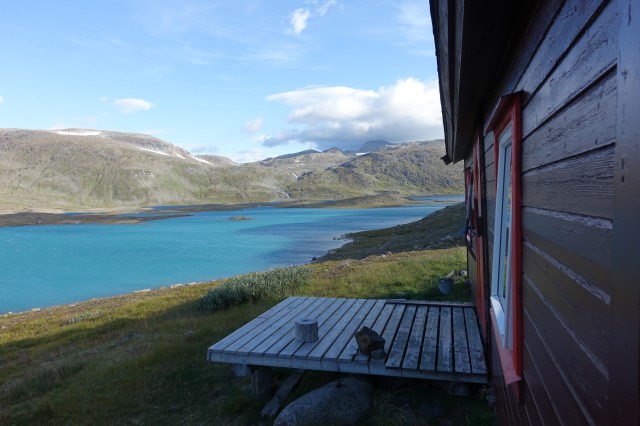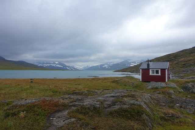 Nach einem sehr entspannten Pausetage in Sulitjema ging es – wie sollte es auch anderes sein – erst einmal wieder hinauf in die Berge. Immerhin fast 1000 Höhenmeter galt es zu überwinden. Aber langsam macht sich das Training der letzten Wochen doch bezahlt: Erstaunlich schnell haben wir die ersten 400m bis zur Ny-Sulitjelma Hütte hinter uns gebracht und nach einer ausgiebigen Mittagspause vor der Hütte (es war zu dem Zeitpunkt noch angenehm warm), ging es in den zweiten Anstieg. Ich habe mittlerweile so viele norwegische Berge bezwungen, dennoch ist es jedes Mal wieder von Neuem besonders. Schritt für Schritt lässt man die grünen Ebenen und die Baumgrenze hinter sich, der Bewuchs wird immer kleiner und kleiner, bis erst nur noch Moos und schließlich nur noch Fels übrig bleibt. Zeitgleich weitet sich die Landschaft und gibt den Blick frei. So auch an diesem Tag. Plötzlich stehe ich mitten in der felsigen Einsamkeit, umringt von hohen, schroffen Bergen. Hier und da blitzen Gletscherzungen aus den hohen Wolken hervor und auf einmal sind auch die Altschneefelder wieder da. Was ein Anblick. Ich überquere einem hohen Pass und habe das Gefühl, als beträte ich eine neue Welt. Unter mir liegt ein türkisgrüner See an dessen Ende ich bereits die Sorjushütte ausmachen kann. Auf halben Weg nach unten treffe ich Stefan, es beginnt zu regnen und wir sind beide froh, als wir die Hütte erreichen und die Tür hinter uns schließen. Auch wenn wir die Wettervorhersage nicht kennen würden, spüren wir beide, dass sich da draußen etwas zusammenbraut. Da die Haupthütte fast voll belegt ist, beziehen wir die deutlich kleinere Nebenhütte. Es ist klein und eng, hat aber einen entscheidenden Vorteil: Vom Tisch am Fenster haben wir den direkten Blick auf den türkisblauen See und die umliegenden Berge. Und man braucht nur zwei Stücke Holz, um den 10 Quadratmeter großen Raum faktisch in eine Sauna zu verwandeln. Abends, als ich zum Zähneputzen vor die Tür trete, weht ein seltsam warmer, böeiger Wind. „Ich bin gespannt, was er im Gepäck hat“, denke ich noch, als ich kurz darauf unter meine Decke krieche. Wenige Stunden später erwache ich von einem Knall, der mich fast aus dem Bett wirft. Nach kurzer Verwirrung wird schnell klar: Der warme Wind ist zu einem mächtigen Sturm angewachsen, der soeben die Tür der Hütte aufgerissen hat. Zum Glück nur auf- und nicht abgerissen…Ich schließe die Tür und lege mich zurück ins Bett. An Schlaf ist erstmal nicht zu denken. Die kleine Hütte ächzt mit jeder Böe, selbst mein Bett wackelt. Ich komme bekanntlich aus Norddeutschland und weiß was Wind ist. Das hier ist auf jeden Fall ein ausgewachsener Sturm. Angekündigt waren Windgeschwindigkeiten um 8-9 Beaufort. Die sind es laut dem Brüllen, Rumpeln und Scheppern da draußen auch. Auch als langsam der Morgen graut, nimmt die Intensität kaum ab. Auf dem See haben sich gewaltige Schaumkronen gebildet und von dem Versuch den Ofen zu befeuern, nehmen wir schnell wieder Abstand, als (erwartungsgemäß) ein umgekehrter Schornsteineffekt einsetzt und uns in kürzester Zeit einnebelt. Nun heißt es abwarten, denn in dem Wind mag keiner vor die Tür. Und es wäre sicherlich auch nicht ratsam. Erst gegen Mittag flaut es ein wenig ab und die Sonne blitzt hervor. Das ist unser Zeitfenster. Denn wenn man dem Wetterbericht trauen darf, wird es nach dem Wind wenige Stunden sonnig und mäßig windig sein. Und dann, wenn der Wind vollkommen zur Ruhe gekommen ist, soll der Starkregen einsetzten. Also los. Wir machen uns auf den Weg und werden schon auf den ersten Meter ordentlich herumgewirbelt. Jeder Schritt wird zum Balanceakt, denn mit unseren großen Rucksäcken bieten wir ordentlich Angriffsfläche. Dennoch, der Weg hinein nach Schweden und in den Padjelanta Nationalpark ist jede Mühe wert. Die offenen flachen Hochtäler sind auch beim meinem mittlerweile vierten Besuch in dieser Region immer wieder beeindruckend. Gegen 17 Uhr beginnt es immer stärker zu regnen und wir sind bis auf die Knochen nass, als wir in Stáddajåhkå ankommen. Die Hütten im Padjelanta Nationalpark werden von der Samischen Tourismusorganisastion verwaltet und sind ein wenig teuer als die norwegischen Hütten. Dafür sind sie alle mit Hüttenwart*innen besetzt, die für mehrere Wochen im Sommer für das Wohl der Wanderer sorgen und mit Glück auch frischgebackenes Brot und geräucherten Fisch verkaufen. Fisch gibt es heute nicht, aber zwei leckere Brotfladen bekommen wir von der sympathischen Hüttenwärtin. Während der Regen immer stärker aufs Dach prasselt, sitzen wir drinnen und hören die ein oder andere Anekdote aus ihrer Zeit hier oben, die mit dem Ende der Saison in wenigen Tagen ebenfalls vorüber geht.